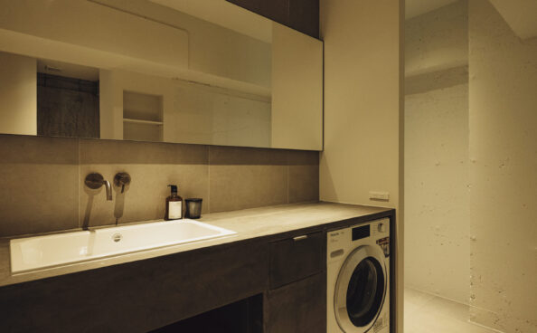 Mieleの洗濯機もサイズを細かく計算し、造作カウンターの中にぴったりと納まるようにしています。