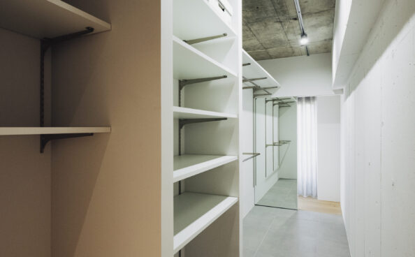 リビングの裏側に回り込むと、そこにはウォークスルー型の収納のスペースが広がっています。
