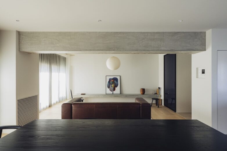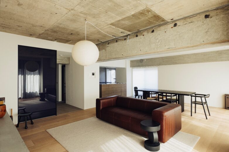 シンプルでニュートラルな内装をベースにしながら、テーブルやスツール、ポスターのフレームなど、ところどころに黒を効かせることで、空間に落ち着いた輪郭が生まれました。